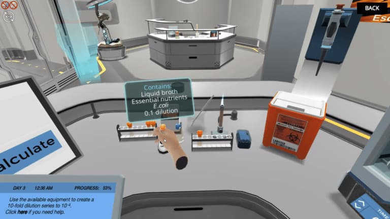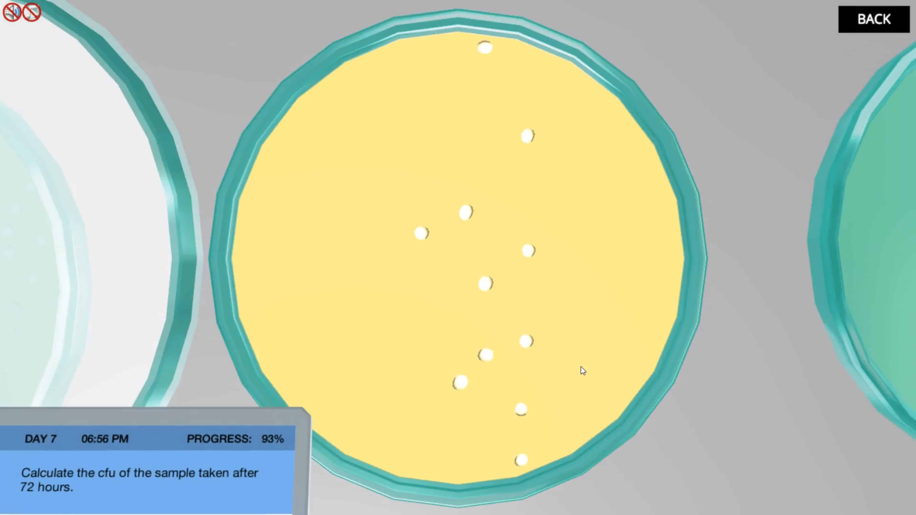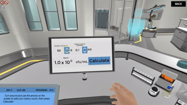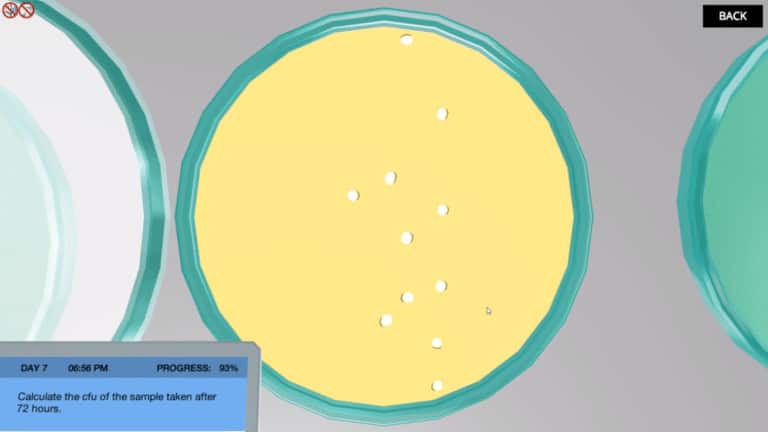 In a real lab, this experiment would take a week or more to complete, but in this simulation it only takes 30 minutes! Plate out countless agar plates in order to quantify the colonies from your serial dilutions, but don’t worry, not a single plate will be wasted. You will learn how to calculate the colony forming units per milliliter (cfu/mL) of your bacterial culture using a cfu calculator.