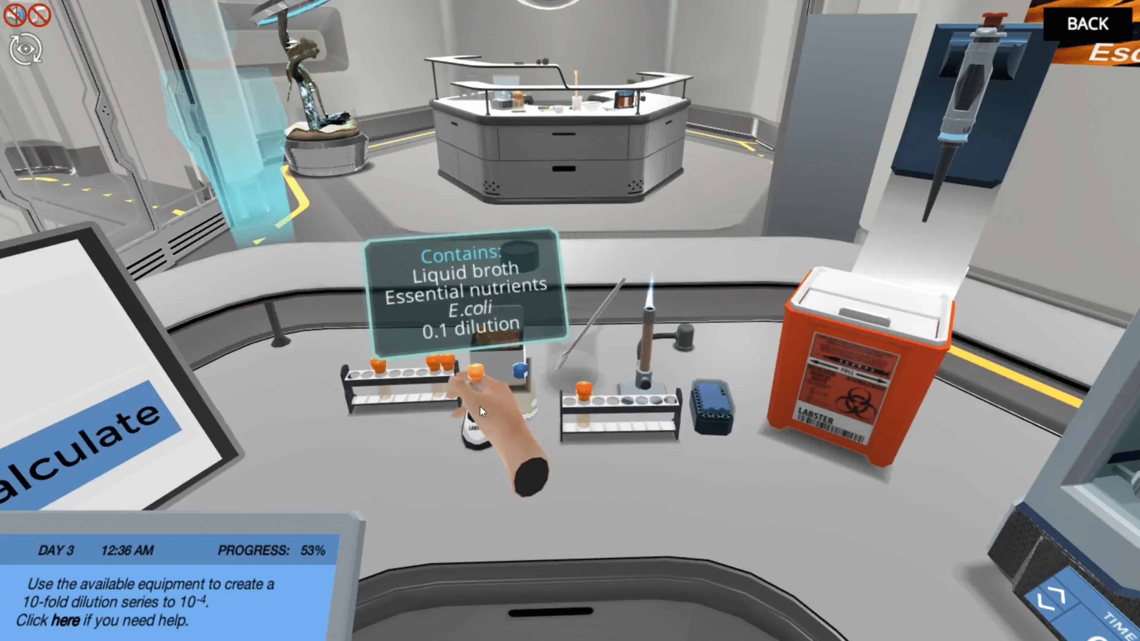 Figure out how to quantify the bacterial cells by inquiry-based learning. You will learn much more by trial and error, and if you are up for the challenge you will be rewarded with some extra questions. Don’t worry, your virtual assistant, Dr. One, will be ready to answer your questions and guide you through the steps needed to perform the serial dilution. Make sure you use sterile techniques to avoid contaminating your bacterial cultures!