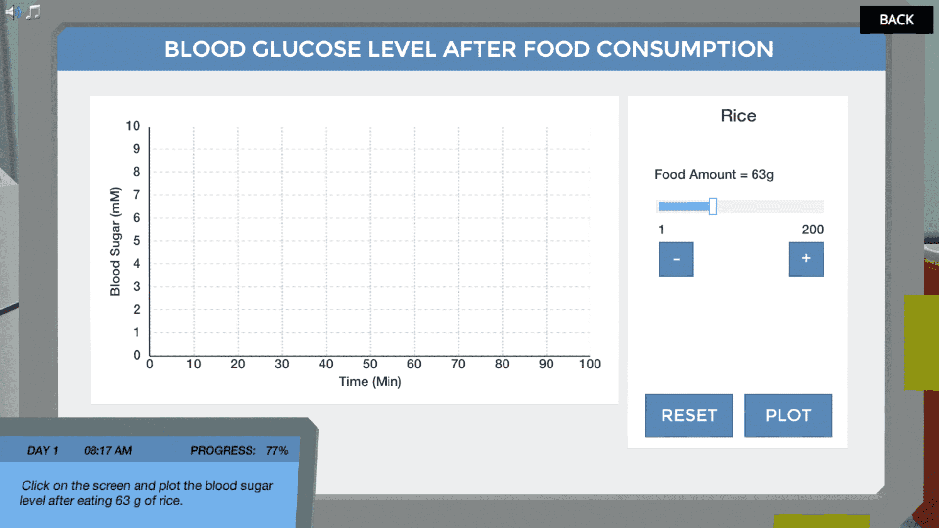 你会发现对血糖水平的影响是非常不同的,这取决于食物的成分。因此,您可以选择不同的食物,并测量虚拟测试对象的血糖水平的升高。
