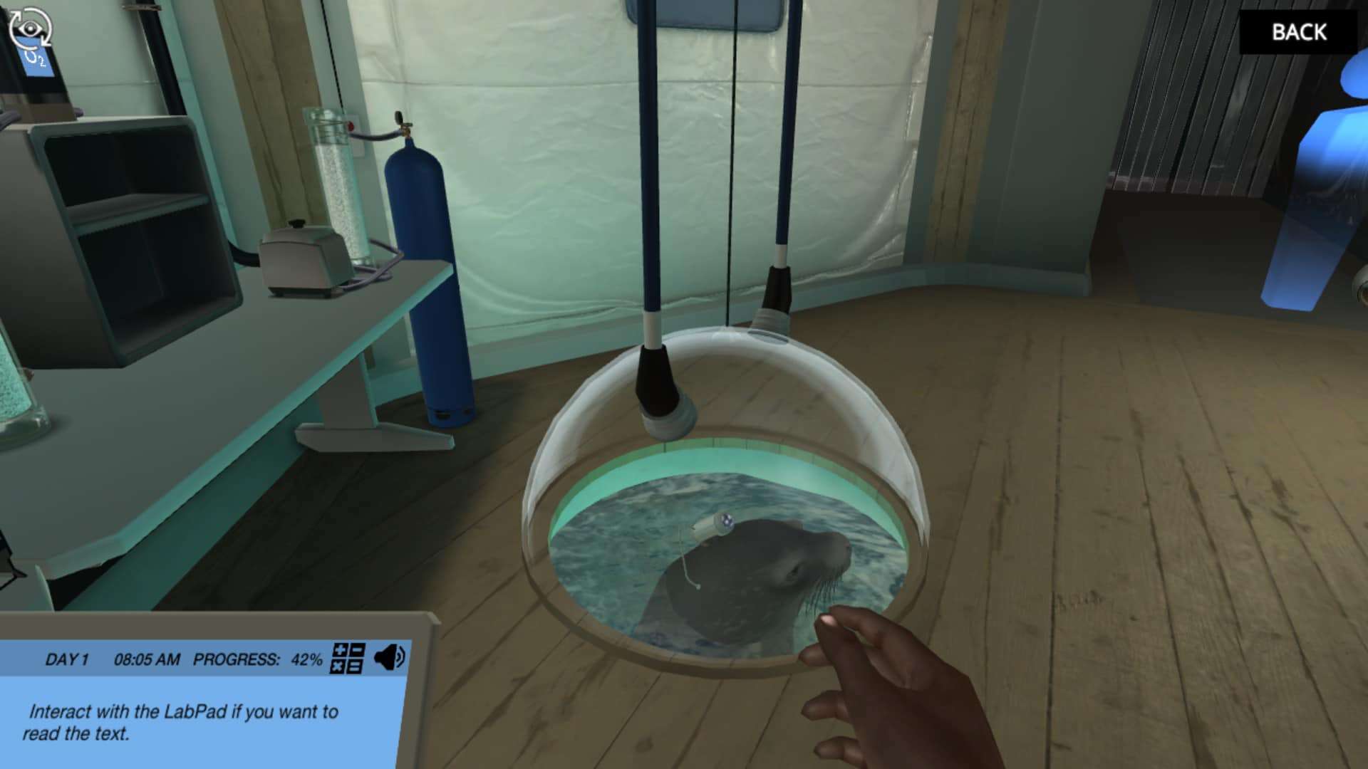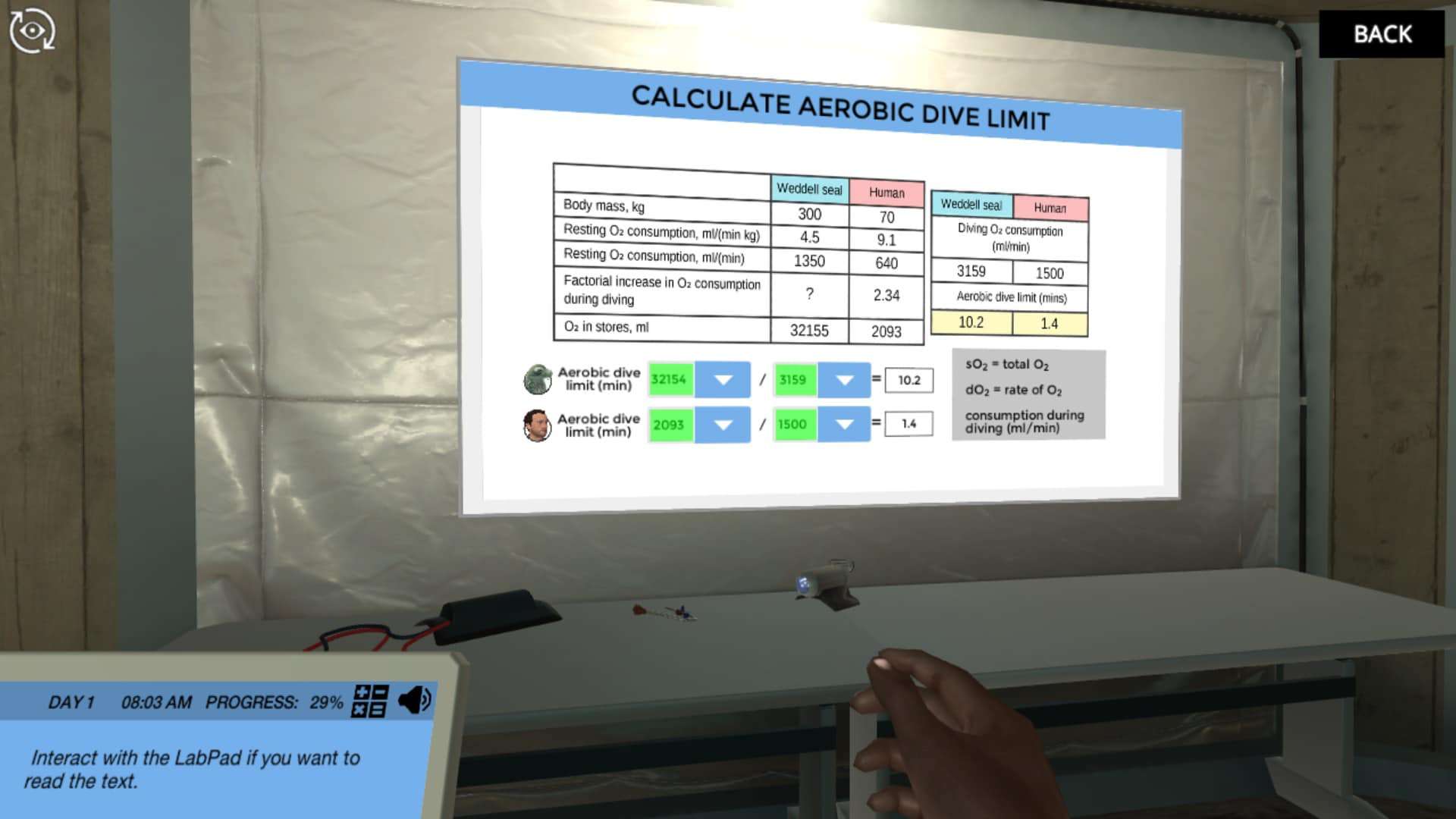 你将为一只威德尔海豹配备摄像机、仪器包和采集血液的导管,并观察它潜水并回到研究小屋的冰洞表面。通过有趣的小游戏,您将计算可用氧,有氧潜水极限和atp生成的有氧和部分无氧潜水。对于每一个正确的结果,你将得到一块拼图!