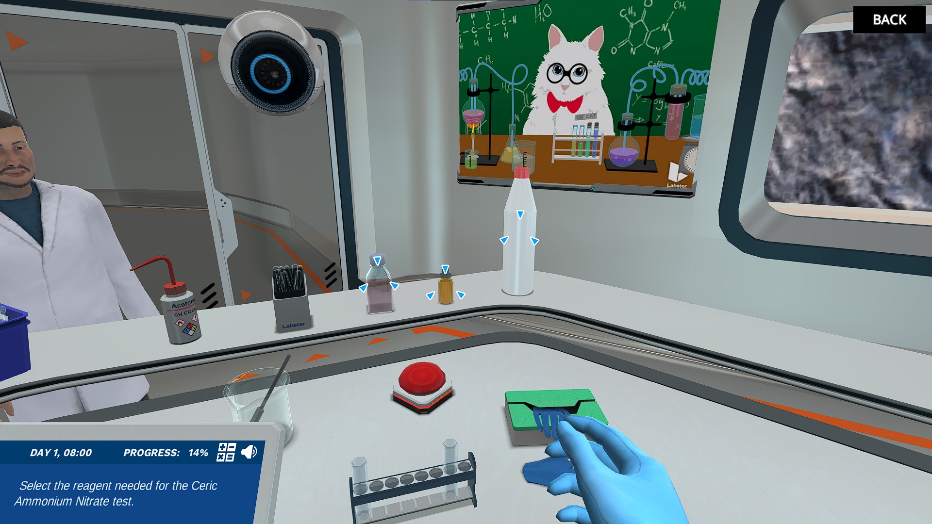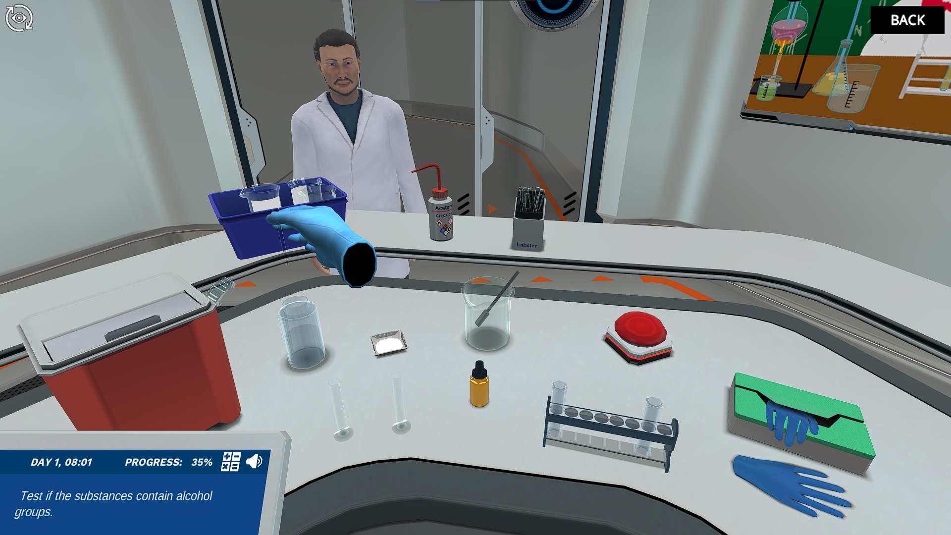 Familiarize yourself with your lab and identify the relevant reagent you will use from the chemicals provided. Perform the ceric ammonium nitrate test on our two mystery samples. By observing a change in color, determine which sample contains alcohol. Stuck? Dr. One and Dr. Ali will help you with any theory or practical questions throughout.