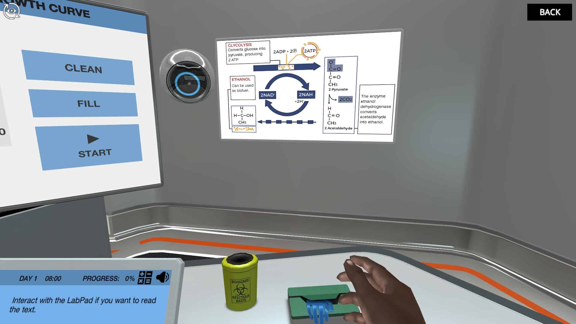 您的使命将是优化生物乙醇生产的试点规模。在设置台式发酵罐或生物反应器后,您将添加酵母接种物,并运行发酵实验。博士将指导您通过第一个实验,包括如何无视野和第一组文化条件制作。一旦您熟悉设备,您可以使用发酵罐自由实验。