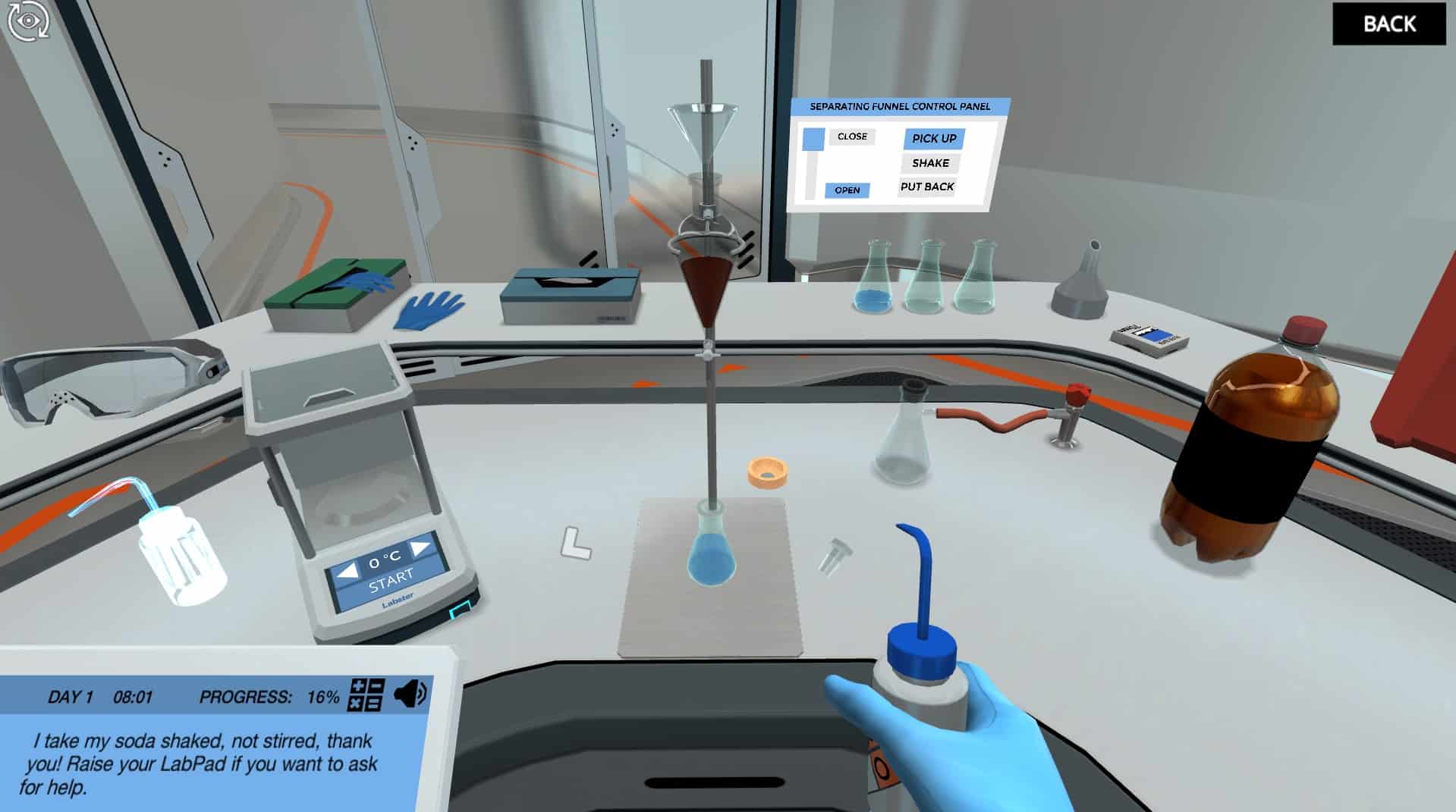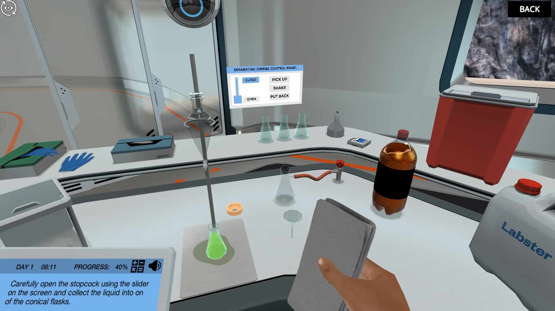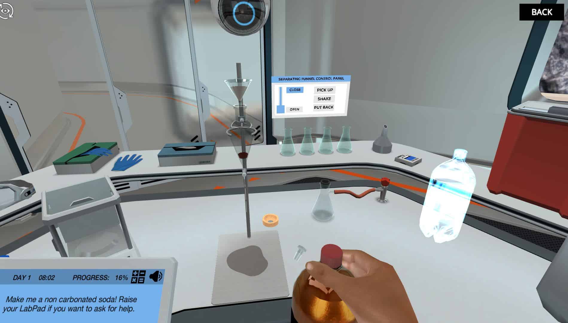 如果你在实验室里犯了错,这个虚拟实验室会帮你。学习如何使用分离漏斗,不要害怕把事情弄糟。在这个模拟中,你有犯错误的自由,并从中学习。如果你弄得一团糟,别担心:一号医生会帮你清理!