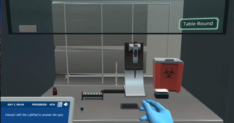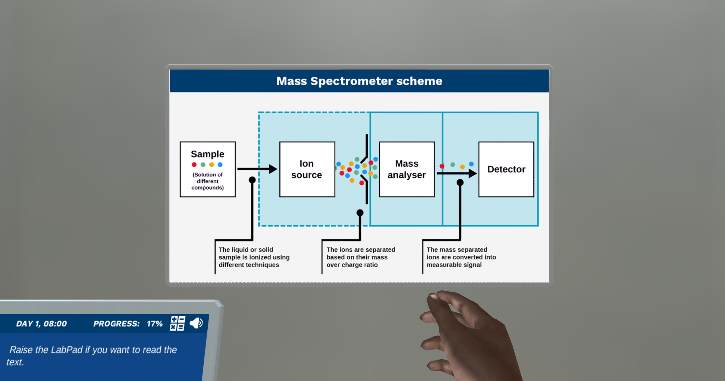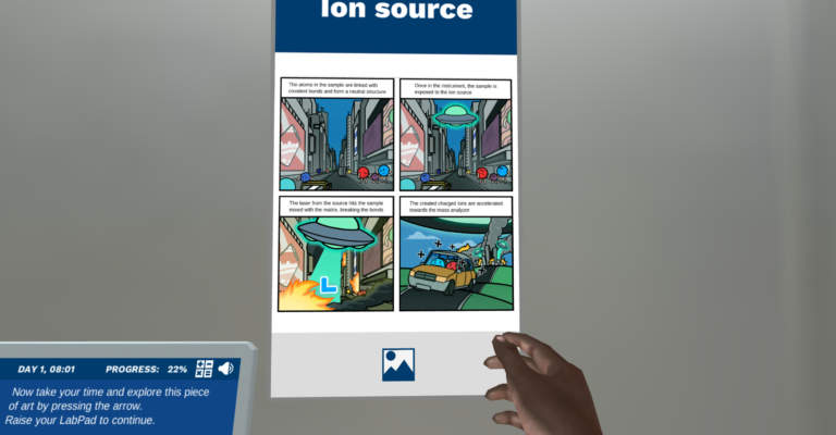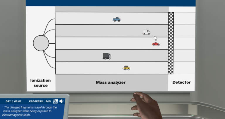 After performing a life-like, guided sample preparation, you will get an introduction to the principles of fragmentation. This topic can often be hard to understand, so you’ll be guided by your AI lab assistant Dr. One through different posters and quizzes to ensure good comprehension.