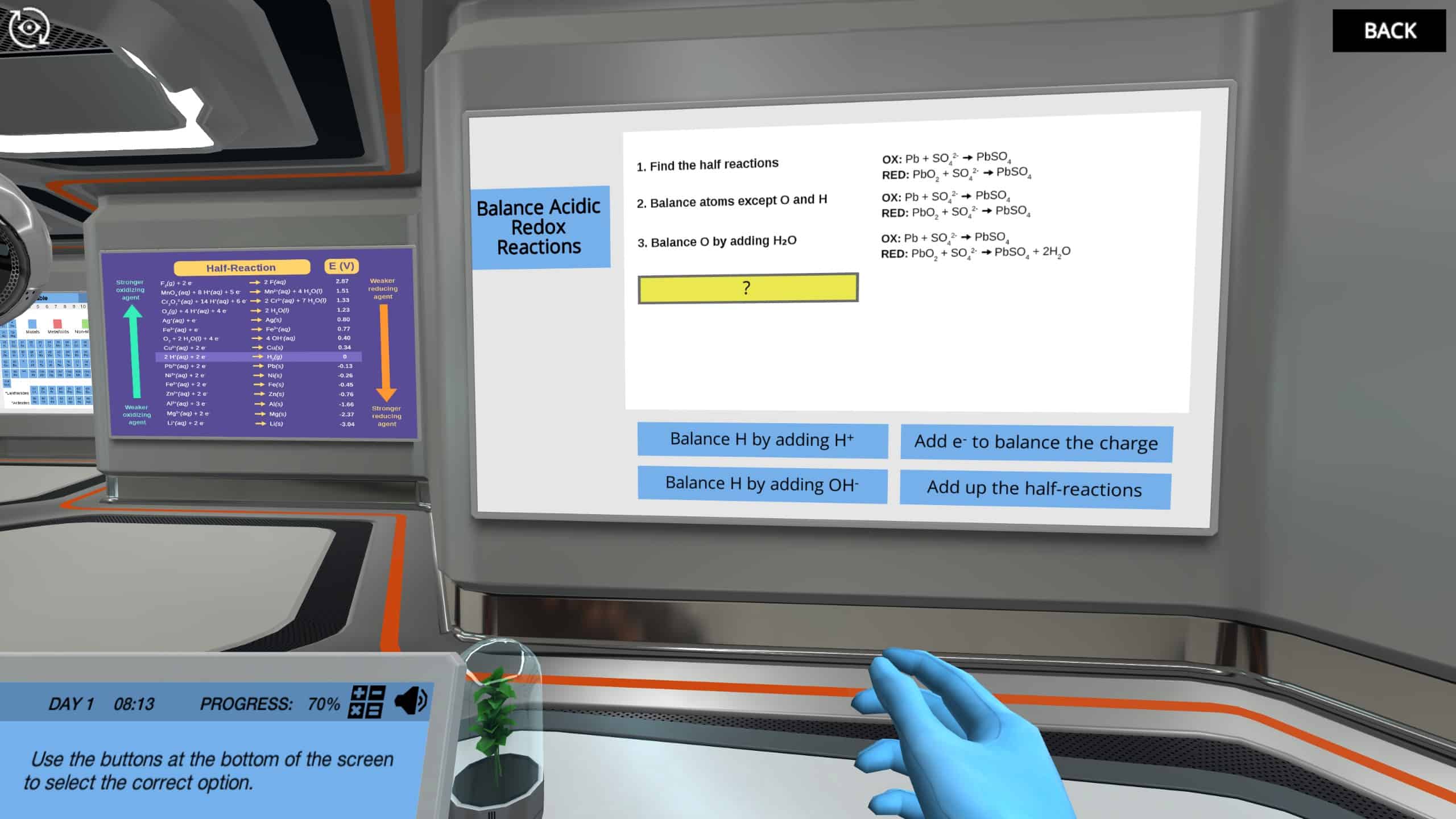 根据铜和不同水溶液的还原电位,发展和测试一个关于铜和不同水溶液反应的假设。这些势如何帮助你预测氧化还原反应的方向?电池可以是酸性和碱性的,所以接下来,加入Dr. One,一步一步地平衡两种环境下的氧化还原反应。