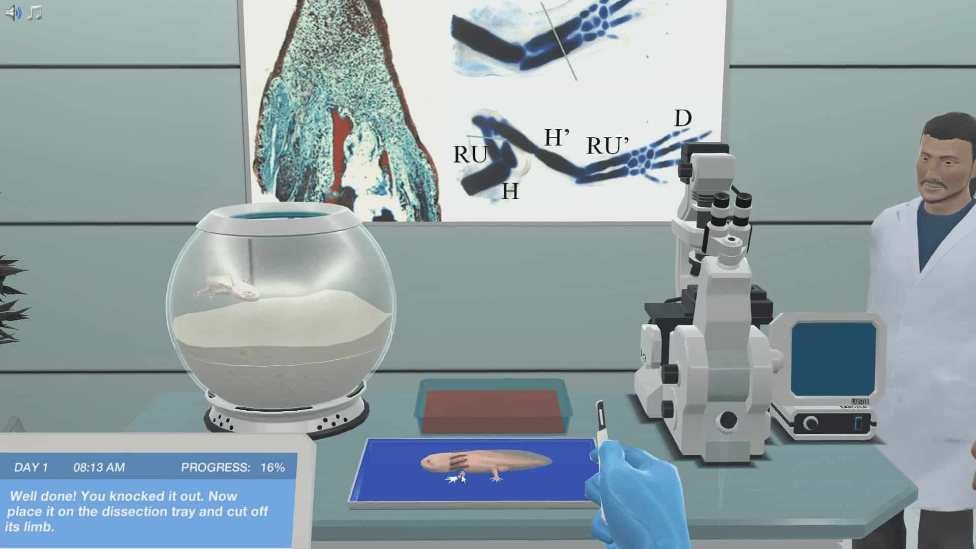 在再生生物学实验室,你将能够在几分钟内解剖蝾螈并观察再生过程,而不是几周。通过这种方式,你可以在不同的条件下进行实验,例如缝合伤口,并立即看到它如何影响组织——所有这些都不会伤害任何真正的动物。使用显微镜,你还将分析再生残肢的组织样本,以确定涉及的细胞类型。最后,您将利用荧光蛋白通过突变蝾螈的产生来探索位置信息的概念及其在再生生物学中的重要性。