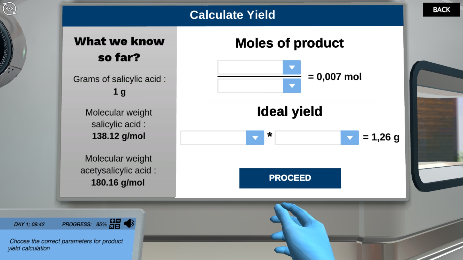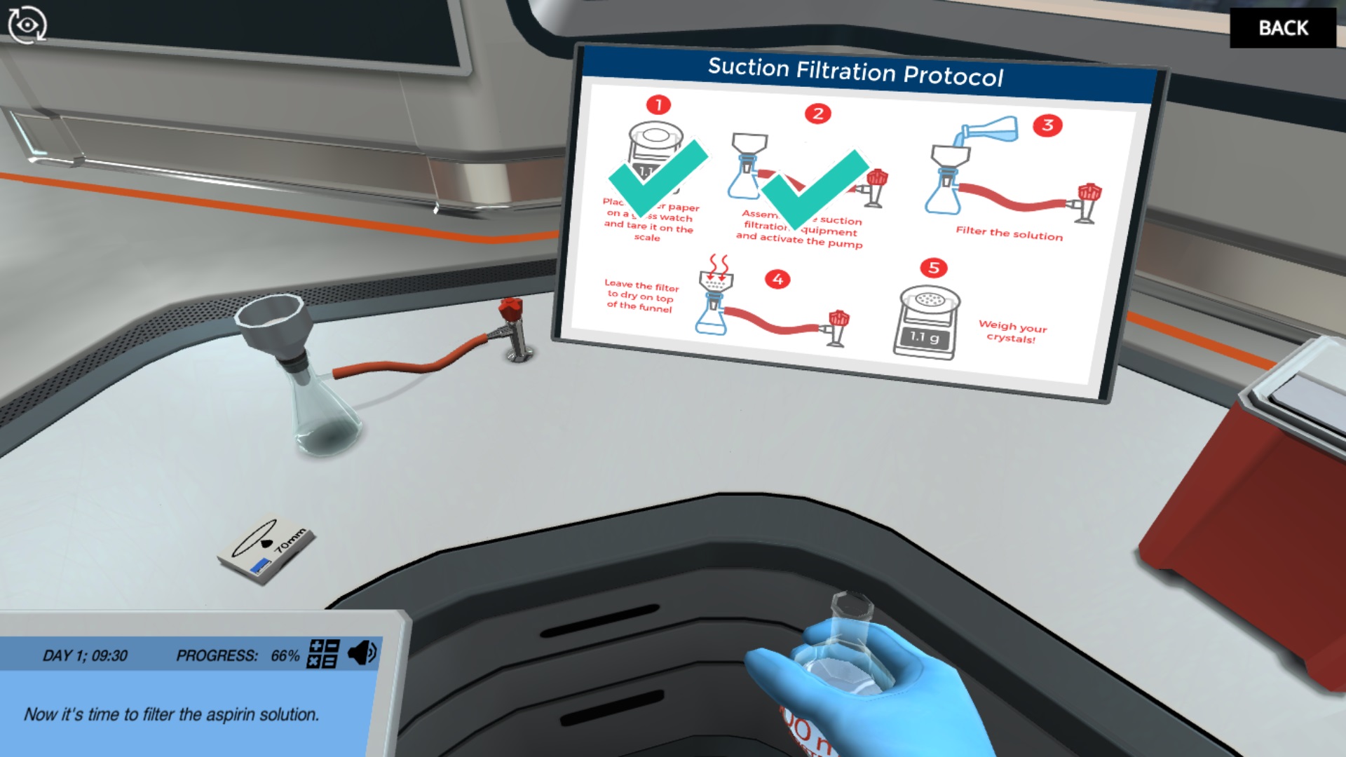 The practical part of the simulation begins. Following the canonical synthetic route, you go through the steps of a synthesis like you would in a real laboratory, with some precious time gained! In our virtual lab, multiple actions can happen simultaneously and you can speed up time.