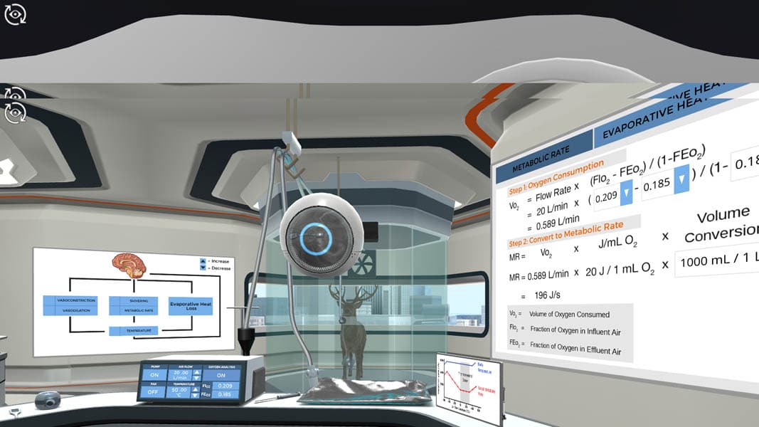 You will alter the temperature and air flow through a sophisticated metabolic chamber holding a deer. An oxygen analyzer measures the oxygen content of air flowing in and out of the chamber and allows you to calculate and compare the metabolic rate of deer at different temperatures. Using a face mask on the deer attached to a Douglas bag, you will be able to measure the humidity and volume of exhaled air at different temperatures. This allows you to determine which factors change in order to help the deer maintain thermal homeostasis. In this simulation, you can repeat experiments quickly at various temperatures for deer during summer and winter months, with and without wind. An emphasis on unit conversions ensures that you are able to compare your calculations for heat production with heat loss and ultimately with fat burned per day to identify how long deer can survive in Northern conditions.