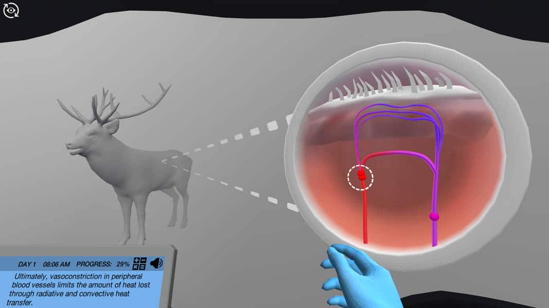 The International Climate Change Committee wants you to investigate how large animals in the North are affected by changing temperatures. You will therefore collect internal and external body temperature data of deer in Northern Canada before returning to the lab where you will learn how changes to blood vessels can help deer maintain thermal homeostasis. By calculating and comparing potential heat production to potential heat loss, you will be able to determine how deer can optimally respond to changes in temperature.