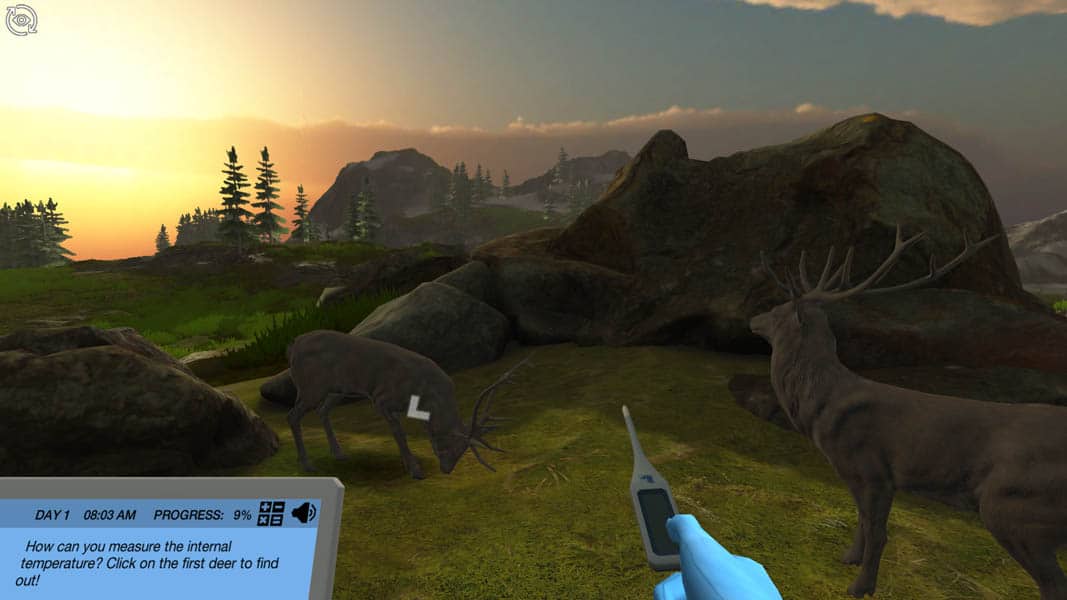 Maintaining a constant body temperature is central to an animal’s survival. In this simulation, you will apply the principles of thermal homeostasis to understand how deer thermoregulate in response to climate change. You will complete field work in Northern Canada and then carry out experiments in the lab on the effect of high temperatures on deer using a metabolic chamber and Douglas bag. You will measure oxygen content, humidity and volume of breath exhaled, and calculate the metabolic rate, evaporative heat loss and fat burned to answer how climate change affects deer in the North.